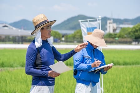 影のない田んぼでの作業には熱中症対策は必須!帽子や機能性インナー、空調服など、さまざまな対策が取られています